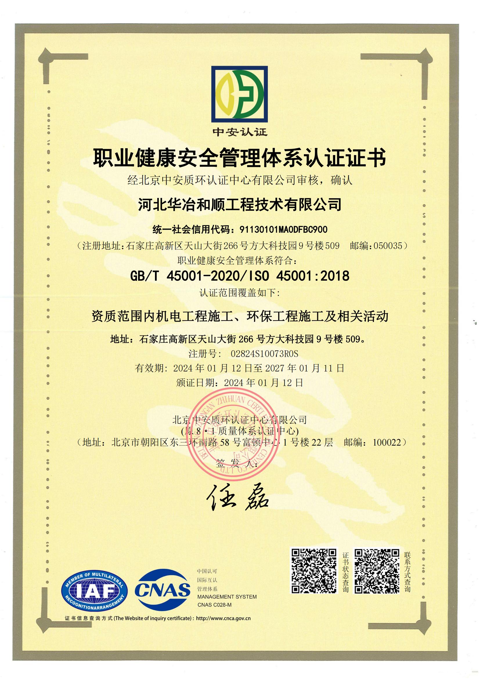 職業(yè)健康安全管理體系認(rèn)證證書(shū)